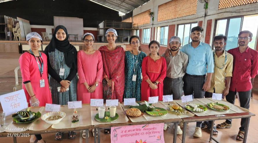 On account of National Ayurveda Day 2025, Department of Swasthavritta conducted innovative Ahara Parva on eve of Poshana Maasa on 23.09.25 at College Auditorium. The students of 2 nd BAMS participated in this event by preparing various kinds of healthy nutritious recipes. 8 teams were made out of 81 students, who prepared all varieties of Ahara Kalpana’s like Krishara, Roti, Soopa, Halwa, Takra, Juices etc. The health benefits, indications and ingredients with its nutritional value of these preparations were explained by the students. There was active participation by the staffs and PG Scholars of the department.