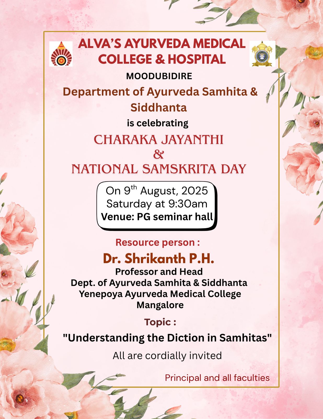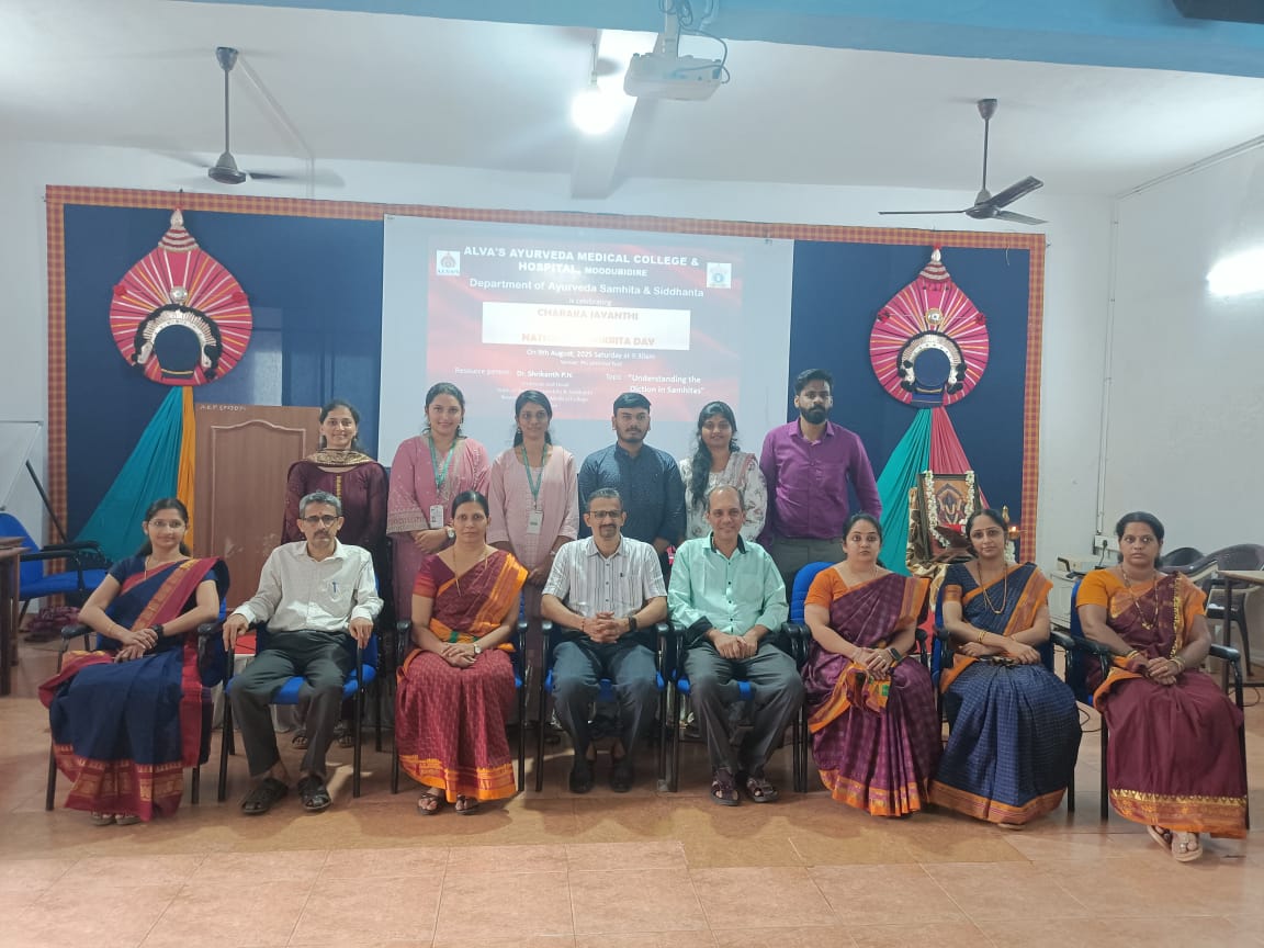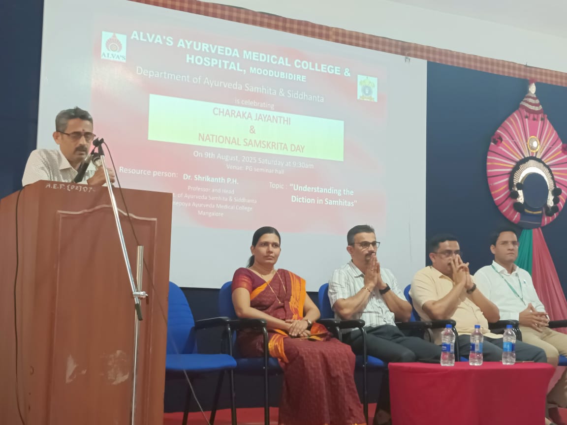 The Department of Ayurveda Samhita & Siddhanta, Alva’s Ayurveda Medical College & Hospital, Moodubidire, successfully celebrated Charaka Jayanthi and National Samskrita Day on 9th August 2025 at the PG Seminar Hall. The programme commenced with a warm welcome address by Mr. Sathyanarayan Bhat, followed by the introduction of the resource person by Dr. Manjula K. The academic session featured an enlightening talk on “Understanding the Diction in Samhitas” by the esteemed resource person Dr. Shrikanth P.H., Professor and Head, Dept. of Ayurveda Samhita & Siddhanta, Yenepoya Ayurveda Medical College, Mangalore. The event was further enriched by Vachana-Pravachana by Dr. Krishnamurthy M.S. and Dr. Subramanya Padyana, which highlighted the depth and relevance of Samskrita and Samhita traditions in Ayurveda. The programme concluded with a heartfelt vote of thanks by Dr. Soumya S.M., making the celebration academically inspiring and culturally meaningful for all participants.